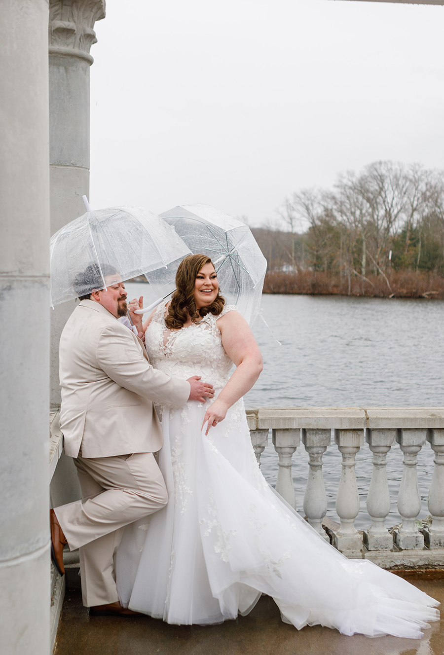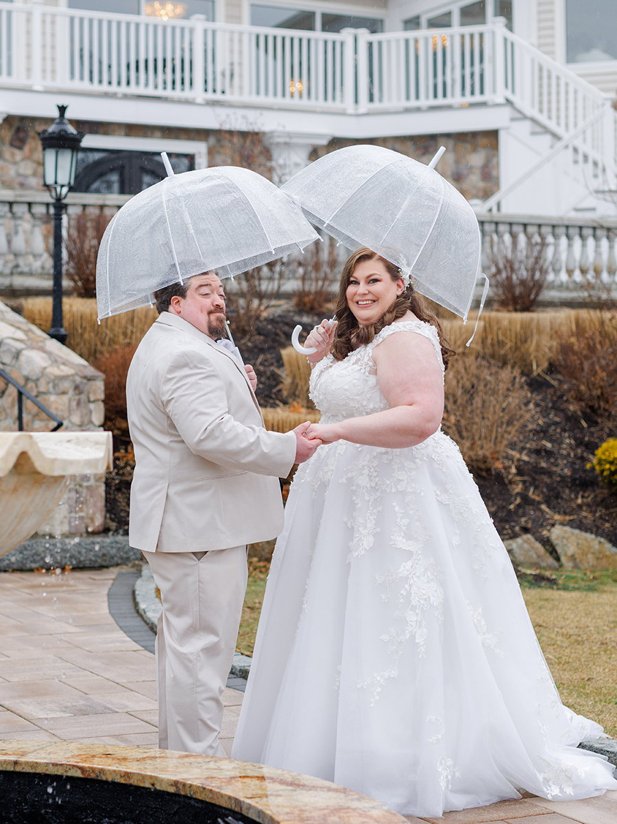 Even though it was raining quite a bit on their day, nothing could spoil Jen & Kevin's mood and we were determined to get some gorgeous wedding portraits for the couple! So armed with clear umbrellas we ventured outside to capture outdoor photos of the bride & groom! I wanted to say a special "thank you!" to Jen's MOH Kristen who braved the rain and cold with us and helped us create some stunning moments!
