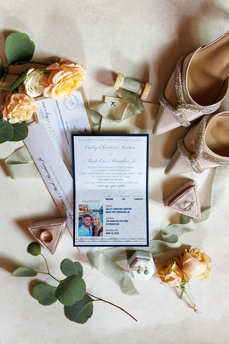 Everyone at the wedding was amazed by Cailey's creative approach to the wedding details! Just take a look at the seating chart! The couple's guests were “traveling” to their table destination and instead of traditional table numbers, each table was named after a destination Cailey & Mark had traveled to. The wedding invitations were miniature works of art, resembling passports and plane tickets!
